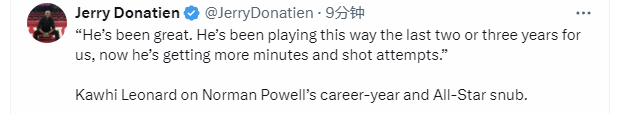 在谈到队友鲍威尔落选全明星的话题时,莱昂纳德鼓励了自己的队友:“他一直很棒,过去两三年他一直是这样打球的,现在他得到了更多的上场时间和投篮机会。”