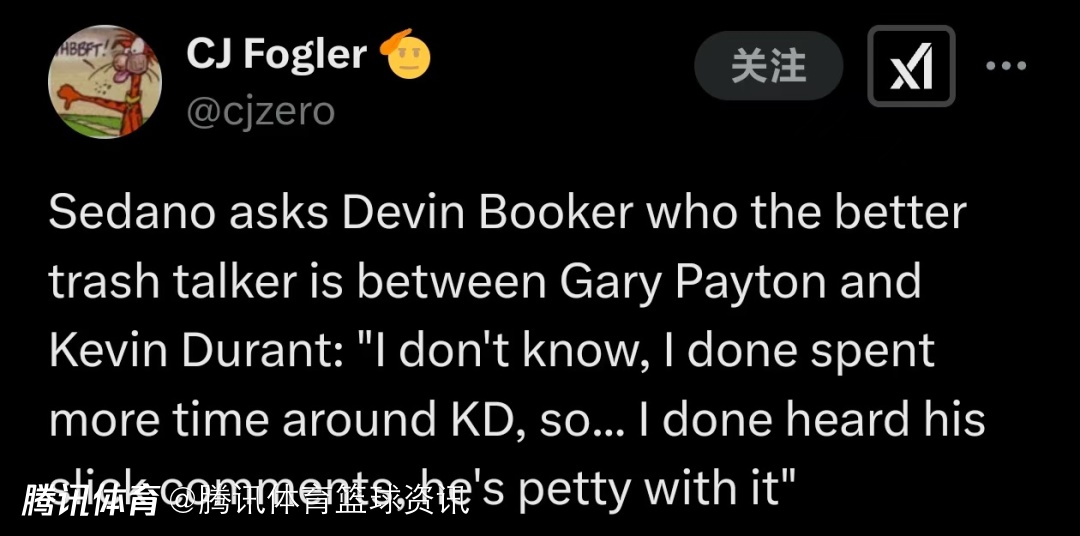 当被问及杜兰特和小佩顿谁更擅长说垃圾话时,布克笑着回答:“我不太确定,毕竟我和杜兰特相处的时间更长。我已经习惯了他那些尖锐的垃圾话,他确实是个喜欢较劲的人。”