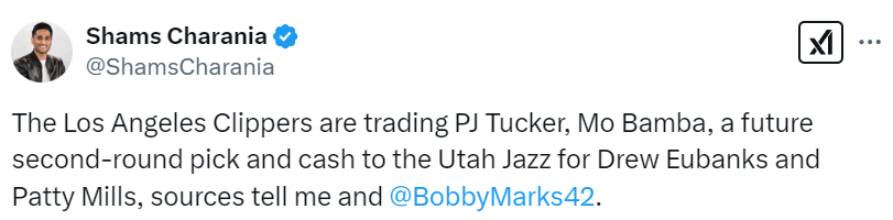 2025-02-02 05:10北京时间2月2日,据名记Shams和Marks报道,快船和爵士达成一笔4换2的交易。快船将塔克、班巴、一个未来的次轮签和部分现金送往爵士,换来尤班克斯和米尔斯。快船队记Murray跟进报道,这个次轮签是快船的2030年次轮签。目前这笔交易已经正式官宣,两队都对离开的球员致谢,并欢迎新援。