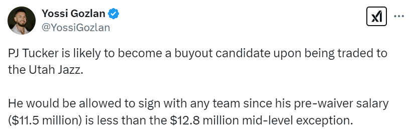 塔克在2022-23赛季曾为54胜的76人首发75场比赛,在2021-22赛季曾为53胜的热火首发70场比赛。如果他被买断,任何球队都有资格签下他,因为他被买断前的薪水是1154万美元,低于1280万美元的中产特例。