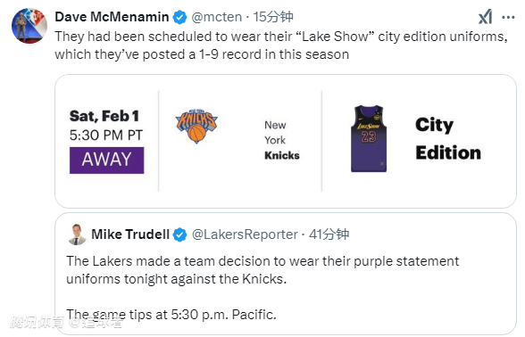 2025-02-02 07:50北京时间2月2日,NBA常规赛湖人客场大战尼克斯,赛前湖人决定更换球衣,据湖人记者Dave McMenamin和Mike Trudell报道,湖人原计划身穿城市版球衣对阵尼克斯,但赛前湖人决定身穿紫色球衣,不穿“LakeShow”城市版球衣。