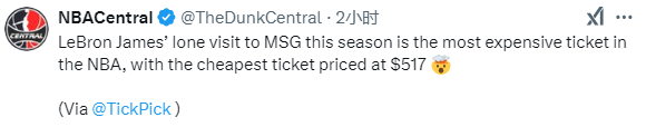 湖人大战尼克斯备受关注,这是湖人和詹姆斯本赛季常规赛唯一一次做客麦迪逊广场花园球馆;票务网站最新票价显示,本场比赛最便宜的票价已经从420美元飙到了517美元,继续刷新本赛季NBA单场比赛纪录。