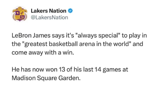 最近14次在麦迪逊花园的比赛中,詹姆斯赢下了其中的13次,在谈到在此打球的感受时,詹姆斯说道:“在世界上最棒的篮球馆 打球并取得胜利总是很特别。”而在被问到未来是否还有机会在这座球馆打球时,詹姆斯说道:“有可能,让我们拭目以待吧。”