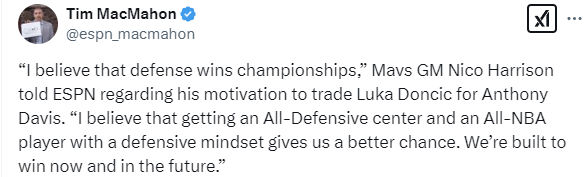 独行侠总经理谈用东契奇换浓眉:相信防守能赢总冠军 一直在为赢球而建队