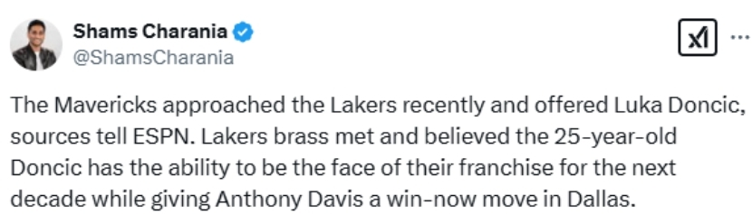 此前,shams曾报道,湖人、独行侠和爵士完成三方交易。湖人队得到东契奇、克勒贝尔和马基夫-莫里斯,独行侠队得到了安东尼-戴维斯、马克斯-克里斯蒂和2029年湖人队的首轮选秀权,爵士队得到了席菲诺、2025年快船队的次轮选秀权、2025年独行侠队的次轮选秀权。