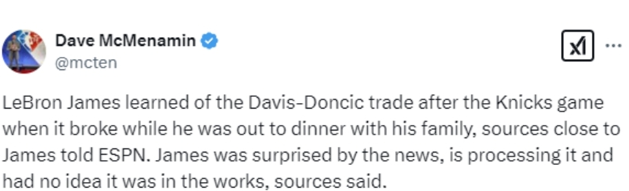 该记者写道:“据詹姆斯身边的消息人士透露,勒布朗-詹姆斯在尼克斯比赛结束后与家人外出吃饭时得知了戴维斯与东契奇的交易。消息人士称,詹姆斯对这一消息感到惊讶,正在消化这一消息,他事先并不知道有这样的交易正在进行中。”