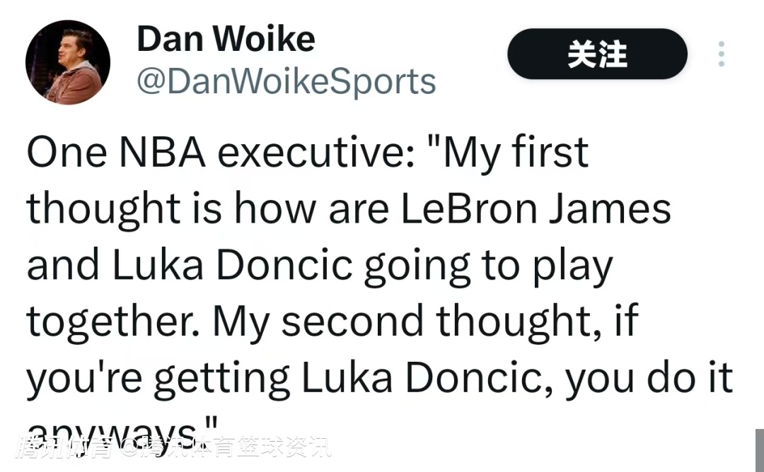 随后,湖人记者Dan Woike在社交媒体上分享了一位NBA高管的观点:“我的第一个想法是,詹姆斯和东契奇会怎样搭档。我的第二个想法是,如果能得到东契奇,无论如何都要抓住机会。”