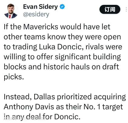 对此,记者Evan Sidery表示:“如果独行侠当时向其他球队表明他们愿意交易东契奇,竞争对手们可能会拿出极具价值的建队核心球员,以及大量的选秀权。”