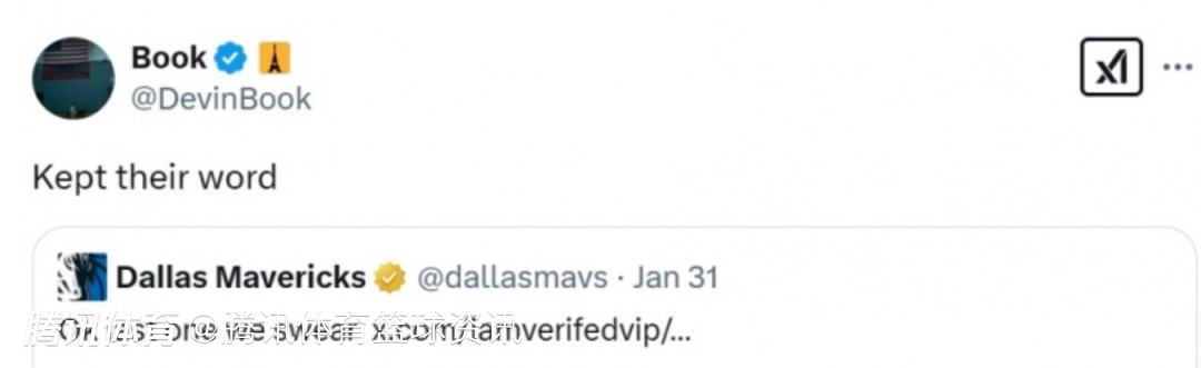 有球迷写道:“你不能随便发一张照片,就指望别人能够看懂。”独行侠官方配上东契奇目视布克的图后写道:“OK,这是最后一次,我们发誓。”而在今天这笔重磅交易发生后,布克也转发评论道:“遵守诺言。”