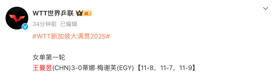 2025-02-02 20:00北京时间2月2日,WTT新加坡大满贯女单,王曼昱3-0力克埃及选手梅谢芙,晋级32强。