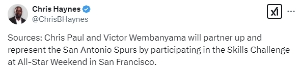 2025-02-03 06:40北京时间2月3日,根据NBA记者Chris Haynes报道,马刺队球员克里斯-保罗和文班亚马将搭档参加全明星技巧挑战赛。