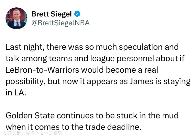 Brett Siegel在社媒写道:“昨晚,各队和NBA工作人员纷纷猜测和讨论詹姆斯加盟勇士是否真有可能,但现在看来詹姆斯会留在洛杉矶,在交易截止日前,勇士(运作方面)的处境仍然会很艰难。”