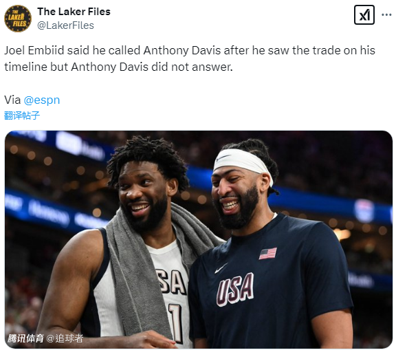 ESPN记者Cassidy Hubbarth报道恩比德对交易的反应,表示:恩比德告诉我,他在看到这笔交易出现后立刻给安东尼-戴维斯打了电话,但戴维斯没有接。他在更衣室里大喊,没人是安全的,包括他自己。