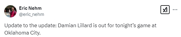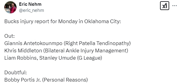 字母哥(右髌骨肌腱病)、克里斯-米德尔顿(双侧脚踝伤势处理)、利拉德(左腹股沟酸痛)均缺席比赛。利亚姆-罗宾斯和斯坦利-乌姆德均被下放到G联赛,此役也无法出战。鲍比-波蒂斯因个人原因此役小概率出战(25%的可能出战)。