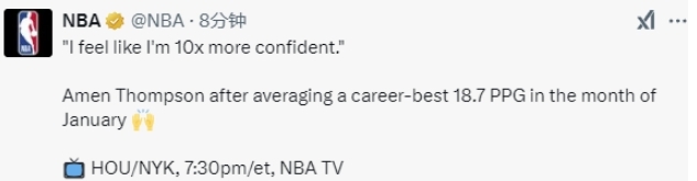 2025-02-04 08:20北京时间2月4日,NBA常规赛继续进行,火箭队对阵尼克斯队。赛前,NBA官方推特发布了一段火箭球员阿门-汤普森的视频,而在视频中,阿门-汤普森也放出豪言:“我比之前自信了10倍,我觉得我真的可以做到任何事情。”