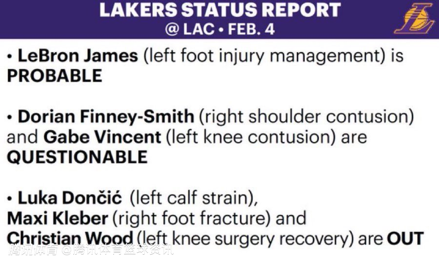 2025-02-04 10:10北京时间2月4日,湖人队官方公布球队明日比赛的伤病报告。詹姆斯大概率出战,DFS和文森特出战成疑。