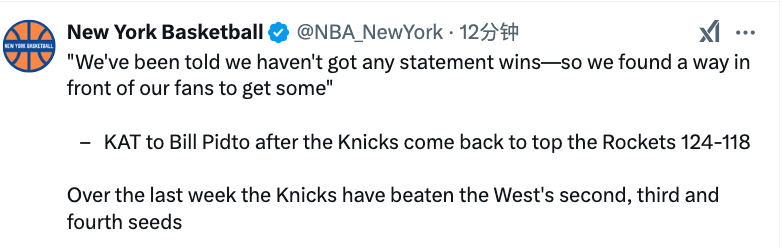 谈及这场胜利,唐斯表示:“我们被告知还没有取得过任何具有代表性的胜利,所以我们想办法在球迷面前去拿下一些胜利。”过去一周,尼克斯分别击败了西部第二(灰熊)、第三(火箭)和第四(掘金)的球队。