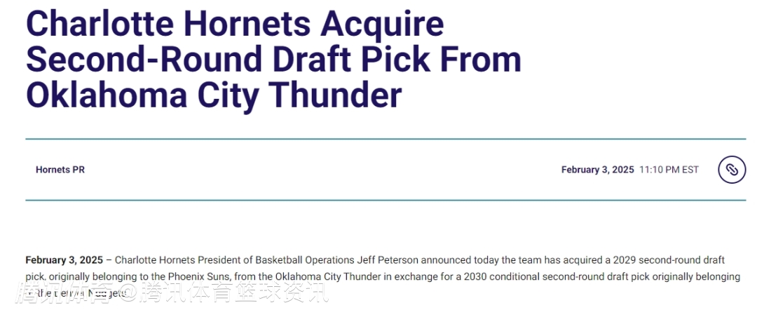 2025-02-04 13:00北京时间2月4日,黄蜂队篮球运营总裁彼得森宣布,他们与雷霆队完成了一笔交易,黄蜂队从雷霆队得到了一个原属于太阳队的2029年次轮选秀权,送出了一个原属于掘金队的2030年受保护的次轮选秀权。