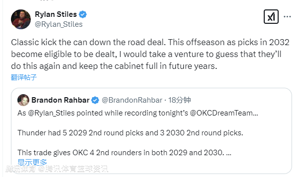 雷霆队记者Rylan Stiles在交易完成后表示,雷霆队原本有5个2029年和3个2030年的次轮选秀权,如今变成了4个2029年和4个2030年次轮选秀权,这是一次经典的拖延性交易,今年休赛期,2032 年的选秀权将有资格被交易,我大胆猜测他们会再次这样做,并在未来几年持续保持拥有充足选秀权。