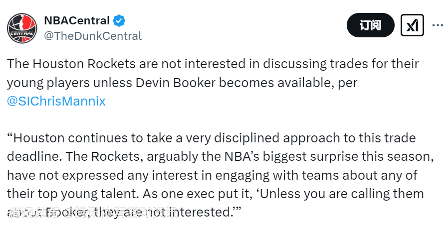 据悉,火箭队在交易截止日之前一直采取非常谨慎的态度。作为本赛季NBA最大的惊喜之一,火箭队并没有表现出任何与其他球队讨论其年轻核心球员的意愿。正如一位高管所说,除非你打电话来谈关于布克的交易,否则他们不会感兴趣的。