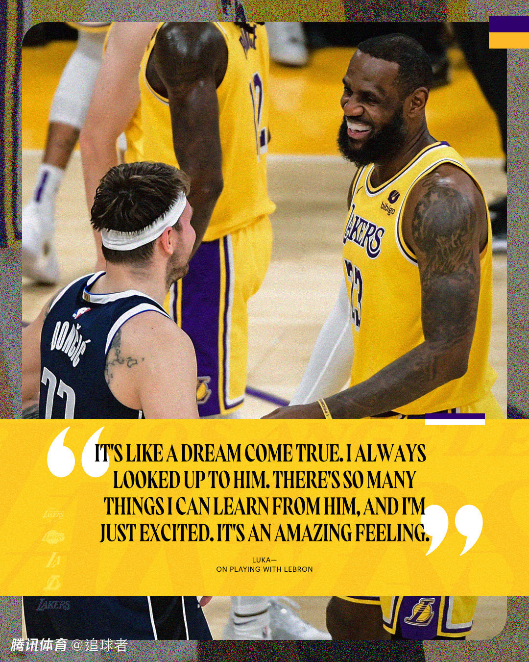 谈到与偶像詹姆斯当队友,东契奇表示:梦想成真了。我一直很敬佩他,我能从他身上学到了很多东西。我很兴奋,这是一种奇妙的感觉。