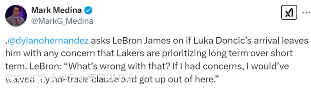 被问及湖人着眼未来进行东契奇的交易一事自己是否会有顾虑,詹姆斯直言:“(着眼未来)又有什么问题?要是我担心的话,早就放弃交易否决权离开了,我现在还在,对湖人是全身心投入的。”