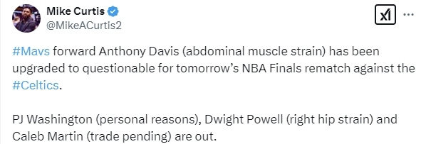 根据独行侠队发布的伤病报告显示,安东尼-戴维斯(腹部肌肉拉伤)出战成疑,莱夫利二世(右脚踝压力性骨折)、PJ-华盛顿(个人原因)、鲍威尔(右髋部拉伤)、凯莱布-马丁(待交易)将缺席比赛。