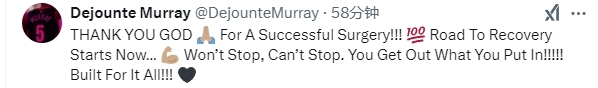 2025-02-06 07:40北京时间2月6日,鹈鹕队球员德章泰-穆雷在个人推特上晒出了自己手术后的照片,并透露自己的手术很成功。