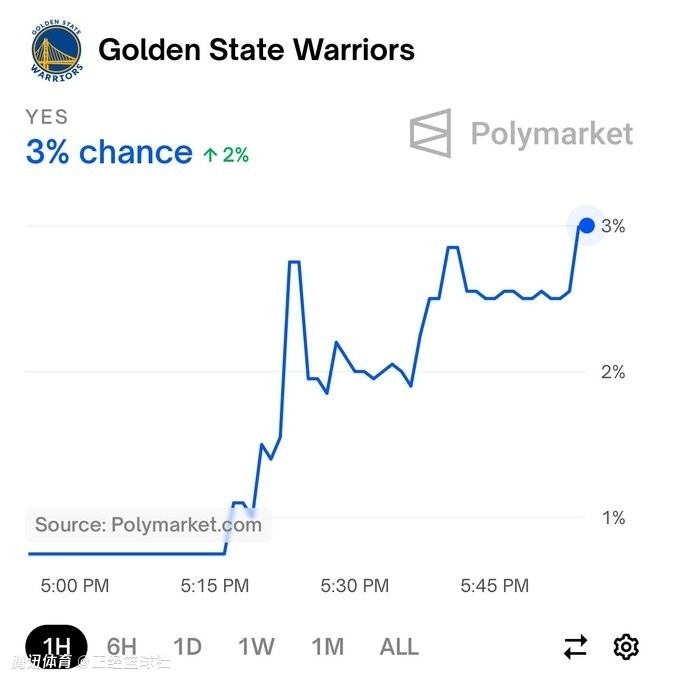 在得到巴特勒之后,勇士队的夺冠赔率和概率都得到增长。美媒Polymarket更新了勇士本赛季的夺冠概率——3%。该数字是原先的5倍。而在赔率方面,勇士队的夺冠赔率瞬间大涨,从+4000到+3000!