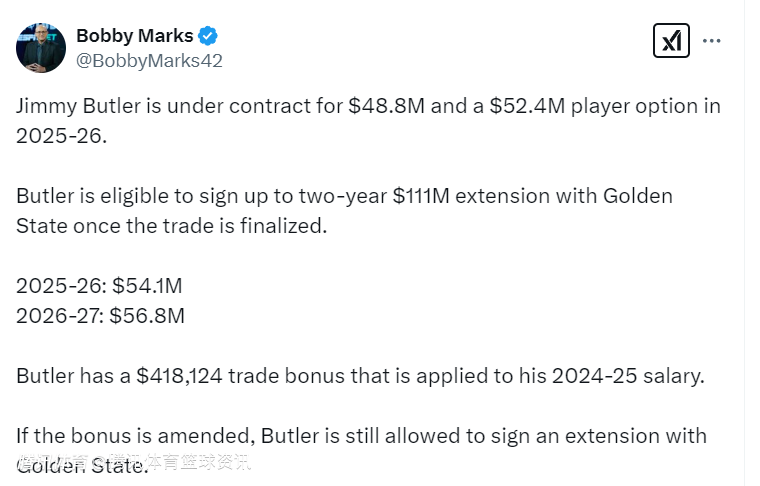 巴特勒的2025-26赛季薪水是5410万美元,2026-27赛季薪水是5680万美元。巴特勒的交易保证金是418124美元,这笔钱将计入他的2024-25赛季的薪水。如果巴特勒放弃这笔钱,勇士可以用来填补他们的名单,并保持在第一土豪线以下。