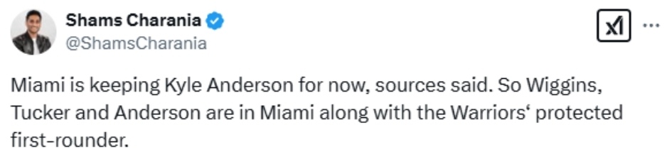 此前,勇士队通过一笔多方大交易得到了吉米-巴特勒,送出了维金斯、李凯尔、施罗德和一个未来受保护的首轮签,其中施罗德被送往爵士队。而在最初的报道中,Shams曾表示李凯尔会被送往猛龙。但此后Shams再次更新个人推特,表示李凯尔去猛龙的交易已经失败了,他目前可能留下,也可能会继续被送走。最终Shams确定,李凯尔被留在了热火队。