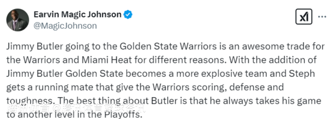 2025-02-06 11:50北京时间2月6日,稍早前勇士热火活塞爵士达成一笔四方交易,吉米-巴特勒被送至勇士,在拒绝了25-26赛季的球员选项后,他则是和勇士达成了一份2年1.21亿的续约合同。对此湖人传奇名宿魔术师约翰逊更新社媒,点评了这笔交易。