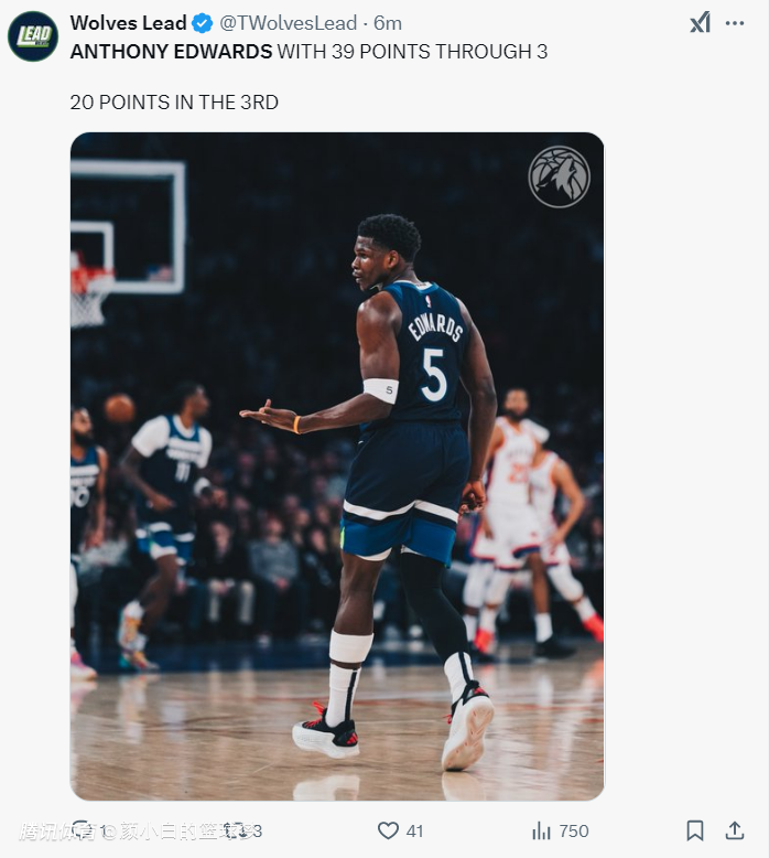 三节打完爱德华兹已经23中12+三分14中6拿到39分7篮板3助攻1抢断1盖帽,他又比了一个三分的庆祝动作。