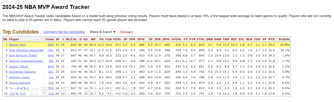 此役后掘金4连胜32胜19负,他们距离西部第三的火箭32胜18负只差0.5个胜场,掘金有希望重返西部前三,约基奇的MVP概率也已经来到65.8%。