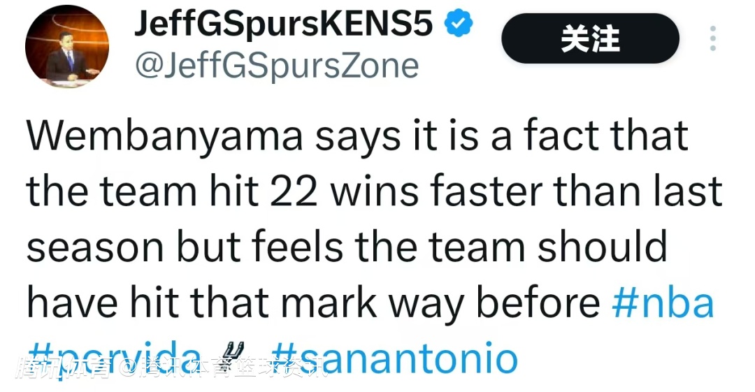 文班亚马表示:“球队比上个赛季更快地取得了22场胜利,这是一个事实。但我认为球队本应该在更早之前就达到这一成绩。”