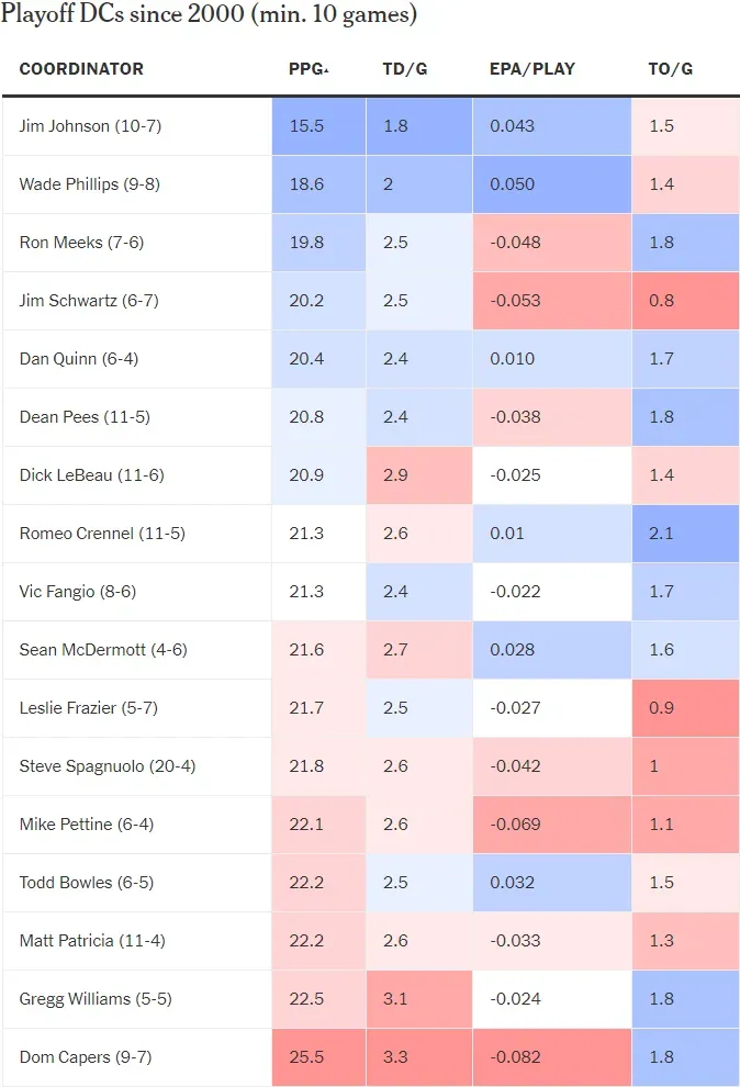 但从2010年以来至少执教过十场季后赛的所有防守协调员来看,吉姆-约翰逊和韦德-菲利普斯在场均失分、场均丢达阵和每档防守EPA都名列前茅。斯帕诺洛的季后赛防守在场均失分只排第12、场均丢达阵第10、防守EPA第13。