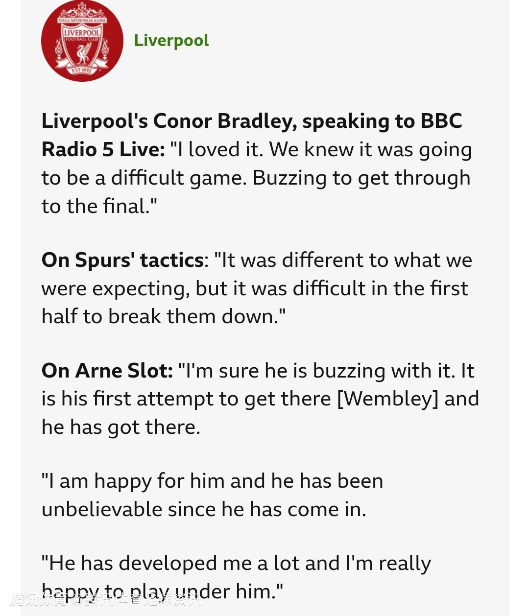 谈到主帅斯洛特时,布拉德利表示:“我敢肯定他现在激动坏了。这是他首次带队冲击(温布利球场),而且他做到了。我为他感到高兴,自从他接手球队以来,他的表现令人难以置信。”