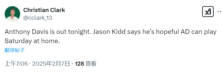 记者Christian Clark也对安东尼-戴维斯今天无法出场的消息进行确认。基德在采访中表示,他希望安东尼-戴维斯能够在周日主场的比赛中复出,届时,独行侠将对阵火箭。