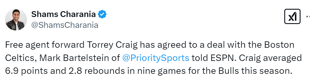 2025-02-07 09:40北京时间2月7日,名记Shams发布报道,据经纪人Bartelstein透露,自由球员、前锋克雷格已经与凯尔特人队达成了一份加盟协议。签下克雷格后,绿军的常规阵容还有一个名额。