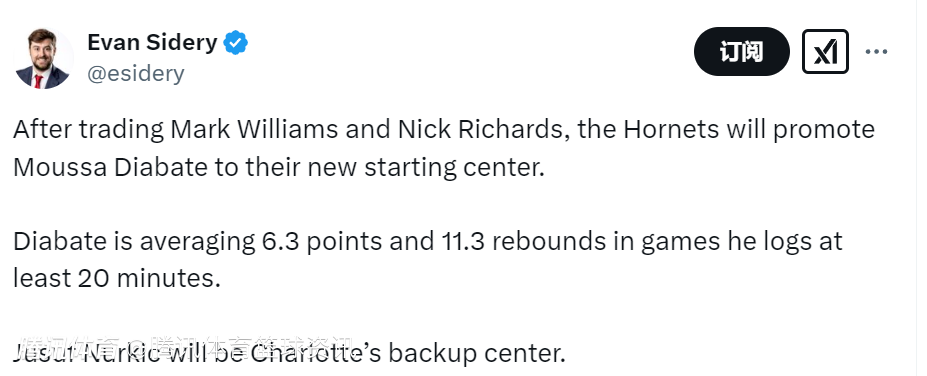 2025-02-07 09:50北京时间2月7日,根据记者Evan sidery的报道,在交易了马克-威廉姆斯和尼克-理查兹之后,黄蜂队将提拔穆萨-迪亚巴特担任他们的新首发中锋。