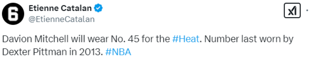 2025-02-07 14:20北京时间2月7日,此前热火勇士活塞爵士猛龙的五方交易案达成,热火方面得到李凯尔、维金斯、达维昂-米切尔和一个首轮签(来自25年勇士,前十保护)。今天球衣记者Etienne Catalan更新社媒,透露了热火这几名新援的球衣号码。
