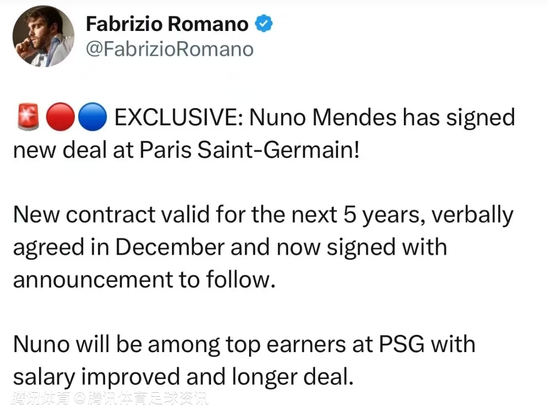 年仅22岁的努诺-门德斯,此前合同将于2026年到期,凭借在赛场上的亮眼表现,早已进入巴黎高层的重点关注名单,续约事宜被早早提上日程。据罗马诺透露,双方早在去年12月便就续约一事达成了口头协定,而如今,这份承诺正式落笔成约。新合同期限为5年,将从今年夏天开启新征程,官宣即将到来。