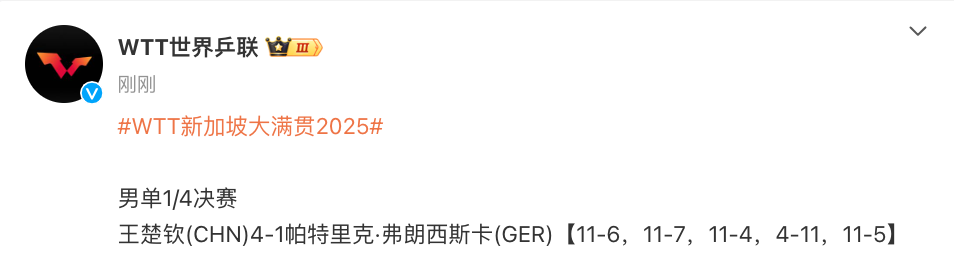 第三局,王楚钦再度先发制人,取得4-1领先,弗朗西斯卡在追分无果的情况下,任由王楚钦将分差拉大,最终王楚钦以11-4拿下第三局。第四局两边战局再度陷入白热化,弗朗西斯卡先行破局,将比分拉开至8-2,最终弗朗西斯卡以11-4拿下第四局,扳回一城。第五局,王楚钦打了弗朗西斯卡一个5-2的开局,没有再给对手反扑机会的王楚钦,以11-5拿下第五局,总比分4-1淘汰弗朗西斯卡,晋级四强。