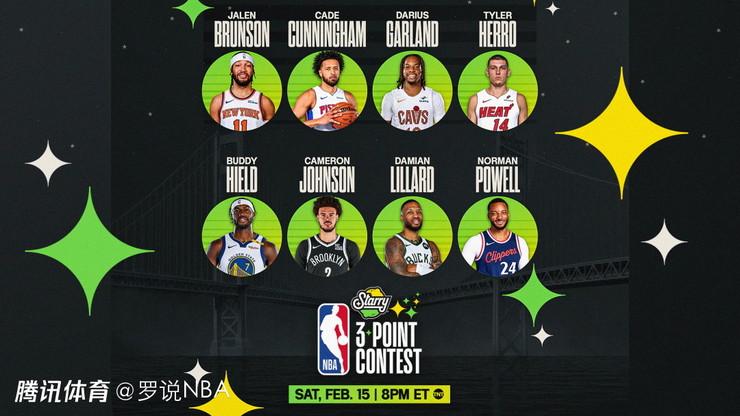 若按本赛季三分命中率的高低来排序参赛者,最准的是快船的鲍威尔(43.1%),随后依次是加兰(42.9%)、卡梅隆-约翰逊(41.7%)、布伦森(39.7%)、希罗(39.3%)、利拉德(37.9%)、希尔德(37.1%)、坎宁安(35.4%)。