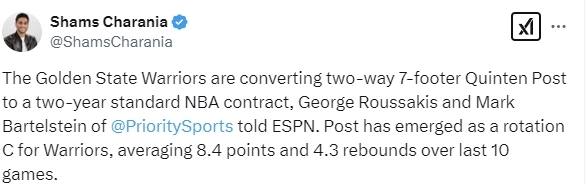 Shams在个人推特上如此写道:“金州勇士队将与身高7尺(约2米13)的双向球员波斯特签订一份为期两年的NBA标准合同。在过去的10场比赛中,波斯特场均得到8.4分和4.3篮板。”