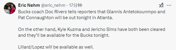 里弗斯:字母哥康诺顿缺战老鹰 库兹马希姆斯迎雄鹿生涯首秀