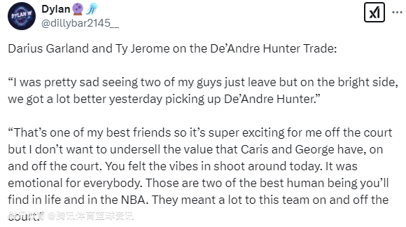 杰罗姆表示:“亨特是我最好的朋友之一,这笔交易让我感到非常兴奋,但我不想贬低勒韦尔和尼昂在场内外的价值。你能感受到今天的气氛,每个人都很激动,他们是生活中和NBA中最好的两个人,他们在场上场下都对球队意义重大。”