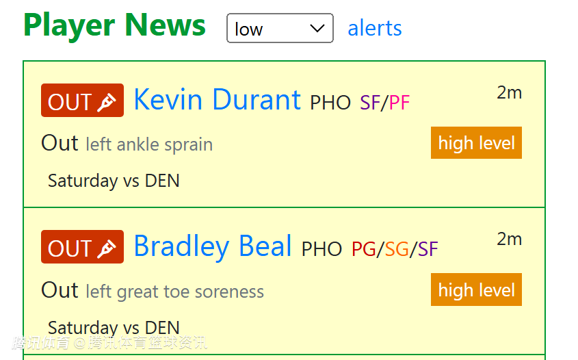 太阳vs掘金伤情报告:杜兰特比尔双双缺阵