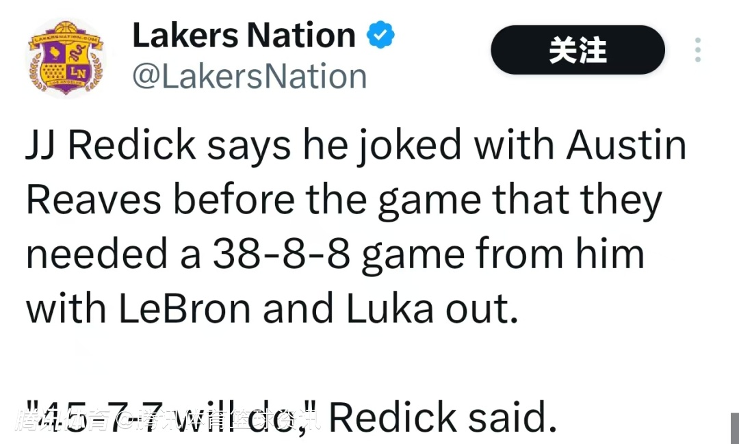 在谈到里夫斯的出色表现时,雷迪克表示比赛前曾和里夫斯开玩笑说,由于詹姆斯和东契奇缺阵,球队需要他打出一场38分8篮板8助攻的比赛,赛后雷迪克则打趣道:“45分7篮板7助攻也行。”