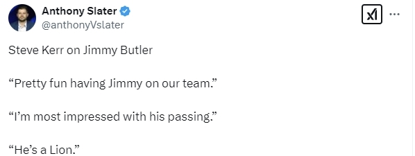 科尔谈到了此役迎来勇士生涯首秀的吉米-巴特勒,他表示:“能让巴特勒加入我们的球队非常有趣。他是一名出色的球员,他制造犯规的能力让我们的比赛变得更稳定。他的传球给我留下了更深刻的印象,他改变了一切,他串联了比赛。只要他在场上,他就是一头雄狮,能给球队带来力量和信心,他给包括斯蒂芬-库里和德雷蒙德-格林在内的其他队友带来了信心,这很重要。”